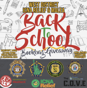 Join JCPD West District, ICNA, and Malea for a FREE Bookbag Giveaway on August 16, 11 AM–1 PM, at 1 Jackson Ave. Kids must be present!