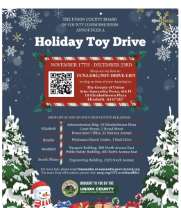 The Union County Board of County Commissioners announces a Holiday Toy Drive that will take place till the 23rd of December. The drop-off is at any of their Union County buildings – Elizabeth, Roselle, Westfield, and Scotch Plains.