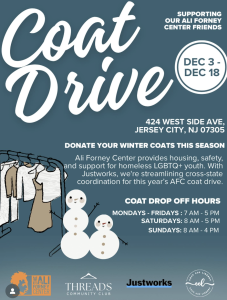 Threads Community Club is partnering with the non-profit Ali Forney Center for a Coat Drive. If you’re in New Jersey, stop by Cosy Cup Library Cafe @cosycuplibrary to drop off your coats and enjoy their limited-edition winter lattes and sweet treats!