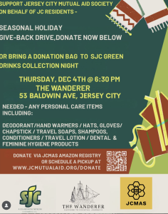 Support the Jersey City Mutual Aid Society by donating to our Seasonal Holiday Give-Back Drive! Donate using the QR code in the flyer, scheduling a pick-up at the link in the flyer, or bringing a donation bag to SJC Green Drinks on December 4th!