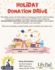 ’Tis the season to share joy! Lily Pad Academy is teaming up with the Youth Foundation of Jersey City to support the students of PS $41. They are collecting non-perishable food items, new toys, and new books. Their holiday donation drive is open until December 19th. Your generosity can help make a big difference.