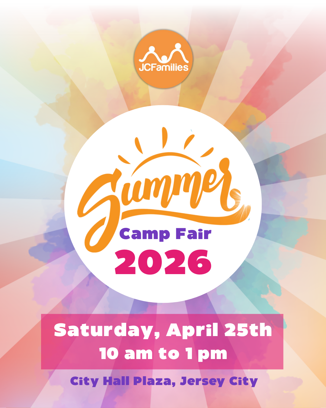 Join JCFamilies’ School Summer Camp Fair on April 25th, 2026, from 10 am to 1 pm at City Hall Plaza, Jersey City. We will also have an entertainment corner for kids with our Fun Under The Sun, which includes music, dance performances, magic shows, bubbles, and more.