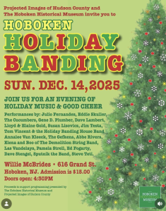 Hoboken Holiday Banding is brought to you by Projected Images of Hudson County and The Hoboken Historical Museum. This will be an evening of music and good cheer. There are several performers lined up. Doors open at 4:30 pm. This is a paid event and there’s an admission fee of $15.