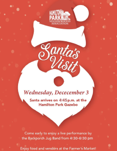 Come, meet Santa at Hamilton Park. Santa arrives at Hamilton Park Gazebo. Come early to enjoy a live performance by the Backporch Jug Band from 4:30 to 6:30 pm. While you are here, you can also check out the vendors at the Farmer’s Market.