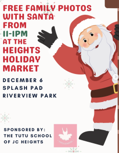 We’ve entered the 1-week countdown for the Heights Holiday Market. Free family photos (pets welcome, too!) will be available at Santa’s Workshop setup in the splash pad near the playground from 11 a.m.- 1 p.m. And here’s a little tip… we recommend getting there early so you can see him make his big entrance! This is sponsored by Tutu School of JC Heights.