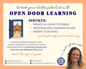 Open Door Learning offers personalized support to help children in PreK–5th grade stay engaged and continue growing over the summer. Private in-home tutoring provides targeted, one-on-one instruction to strengthen reading and writing while building confidence. Personalized learning plans give families simple, structured activities they can use throughout the week to keep learning consistent without feeling overwhelming, aligned with a student’s age and learning goals. Parent coaching offers guidance and practical strategies to help caregivers support their child’s learning at home with ease. Led by Lexi, a certified elementary teacher and reading specialist, all services are designed to make summer learning feel manageable, meaningful, and even fun!