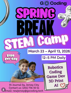Here’s a spring break camp with a lot of STEM activities, all packed into a day, like robotics, coding, AI, Game Dev, 3D Printing, etc. They have flexible dates to match different school schedules — attend any days during your child’s break.