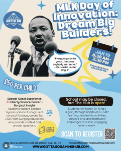 School may be closed, but The Hub is OPEN for an MLK Day experience rooted in innovation, leadership, and service. On January 19, youth will honor Dr. Martin Luther King Jr.’s legacy through hands-on STEAM learning, creative challenges, and teamwork in a safe, engaging space.