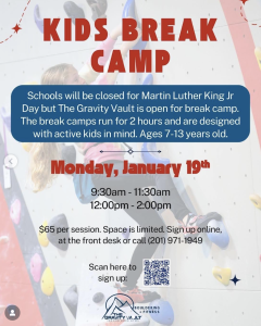 On January 19th, while schools are closed, Gravity Vault will be open! Stop in for their Kids’ Break Camp to take advantage of the day off. The break camp runs for 2 hours and is designed for kids aged 7 to 13 years old. More details here.